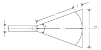 हॉर्न मापदंडों (parameters) का वर्णन किया गया है δ = path difference l = axial length d = aperture dimension θ = flare angle